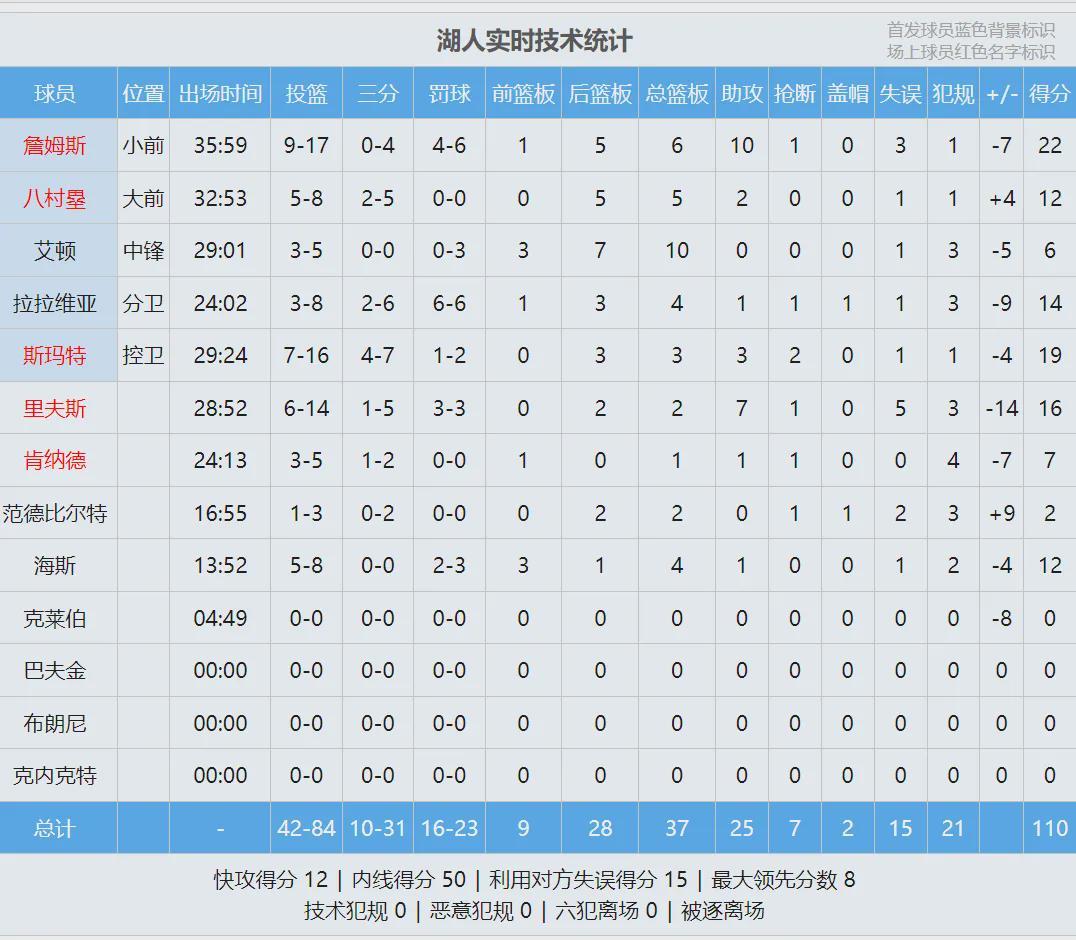 全场结束,湖人110-119不敌雷霆,明天湖人背靠背对阵西部第二的马刺。里夫斯首节4中4,后三节8中2,全场14中6砍下16分2篮板7助攻5失误。詹姆斯17中9,得到22分6篮板10助攻3失误。杰威得到23分,以赛亚-乔砍下19分。